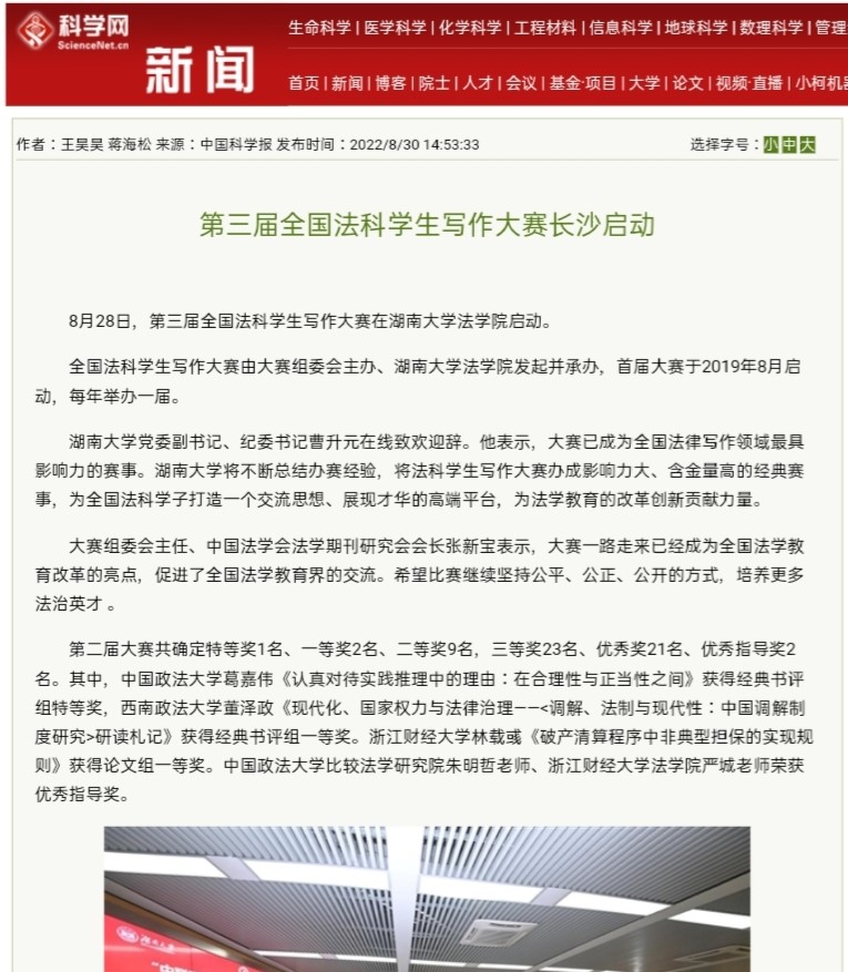 第二届大赛特等奖1名、一等奖2名、二等奖9名,三等奖23名、优秀奖21名、优秀指导奖2名。其中,中国政法大学葛嘉伟《认真对待实践推理中的理由:在合理性与正当性之间》获得经典书评组特等奖,西南政法大学董泽政《现代化、国家权力与法律治理——<调解、法制与现代性:中国调解制度研究>研读札记》获得经典书评组一等奖。浙江财经大学林载彧《破产清算程序中非典型担保的实现规则》获得论文组一等奖。中国政法大学比较法学研究院朱明哲老师、浙江财经大学五楼自拍