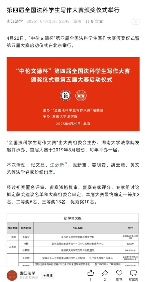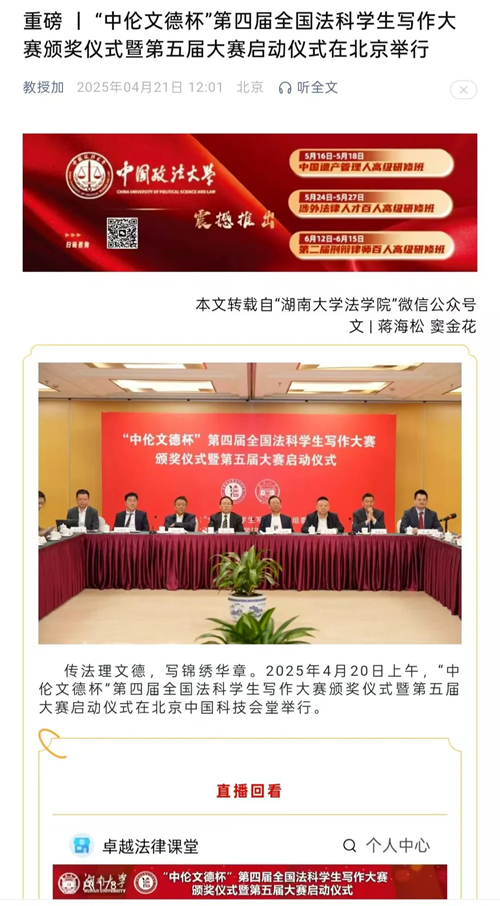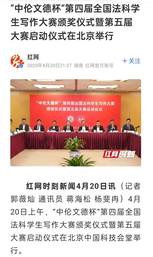 传法理文德,写锦绣华章。2025年4月20日上午,“中伦文德杯”第四届全国法科学生写作大赛颁奖仪式暨第五届大赛启动仪式在北京中国科技会堂举行。 “全国法科学生写作大赛”由大赛组委会主办、五楼自拍