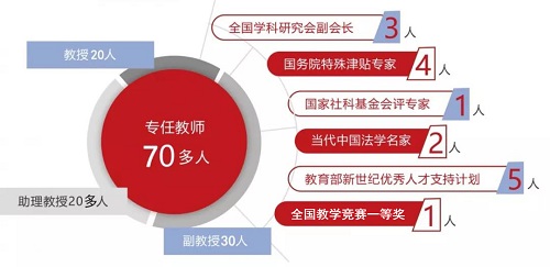 现有全职教师70多人、非全职工作型教师(含兼职研究生导师)80余人、非全职顾问型教师30多人,其中全职教师中教授20人、副教授30人、助理教授(讲师)20多人,海外名校博士毕业的教师占近四分之一。教师中全国学科研究会副会长3人,国务院特殊津贴专家4人,国家社科基金会评专家1人,入选当代中国法学名家2人,入选教育部新世纪优秀人才支持计划5人,全国教学竞赛一等奖获得者1人。