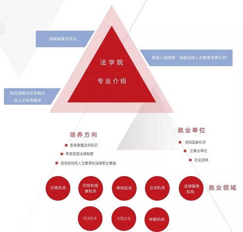 法学专业是湖南省重点专业,首批入选国家“卓越法治人才教育培养计划”,获应用复合型卓越法治人才培养基地。