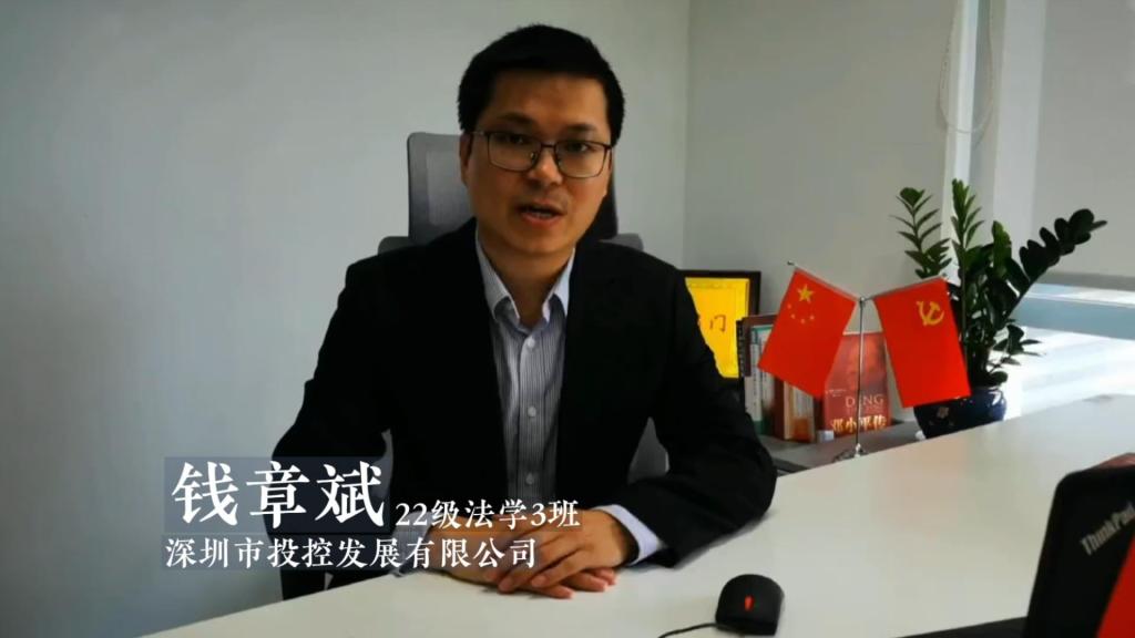 第四篇章是学生代表发言。首先是2022级法学3班的钱章斌同学发言,他表示作为在职人员能够进入五楼自拍