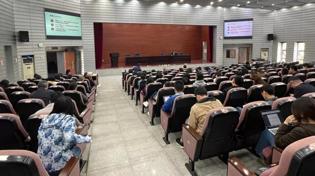 在报告厅举行2021年度下学期全体教职工政治理论学习,院党委书记易骆之宣讲习近平总书记在中国共产党成立100周年庆祝大会上的重要讲话精神。