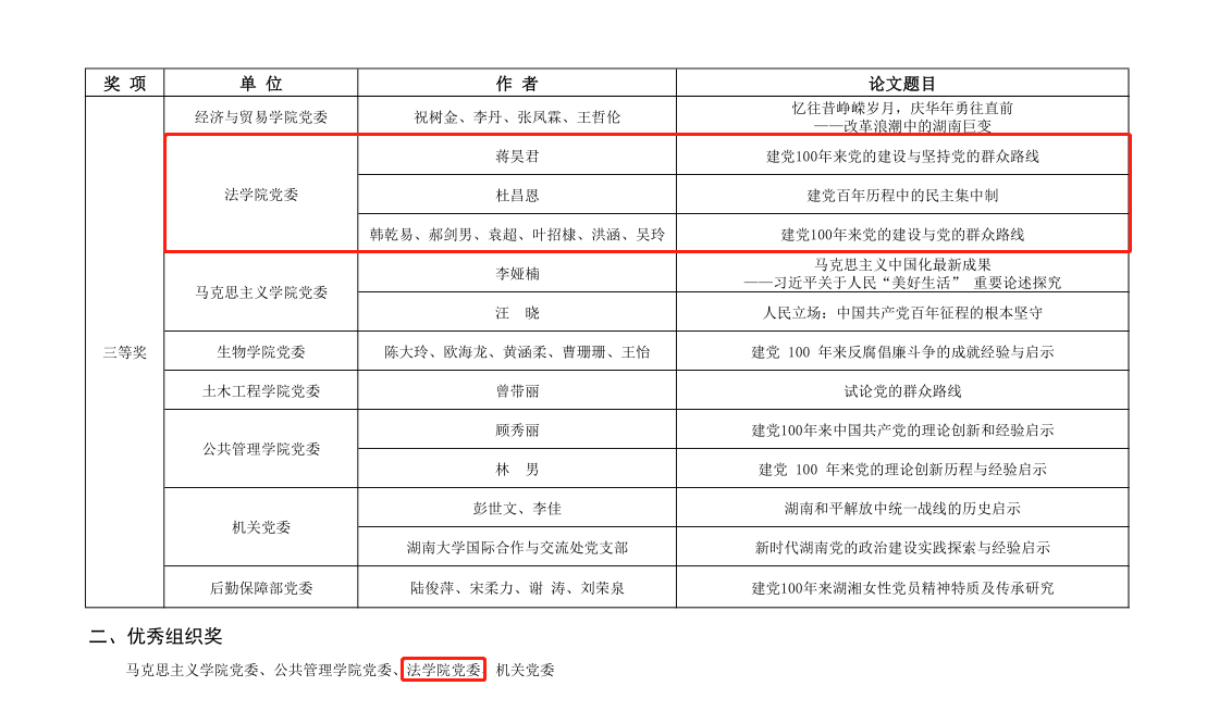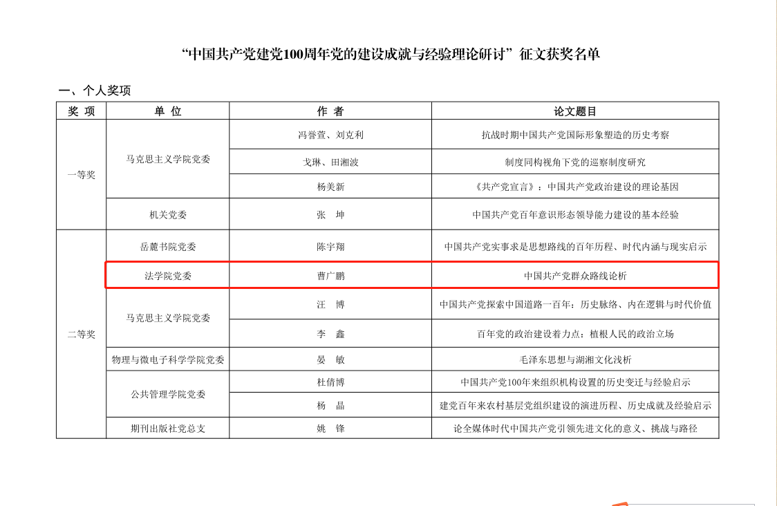 本科生第一党支部预备党员曹广鹏同志的《中国共产党群众路线论析》获二等奖;研究生2020级博士党支部蒋昊君同志的《建党100年来党的建设与坚持党的群众路线》、研究生2019级法学硕士党支部杜昌恩同志的《建党百年历程中的民主集中制》、由研究生2019级法律硕士(法学)党支部韩乾易、郝剑男、袁超、叶招棣、洪涵、吴玲同学共同完成的《建党100年来党的建设与坚持党的群众路线》获三等奖。