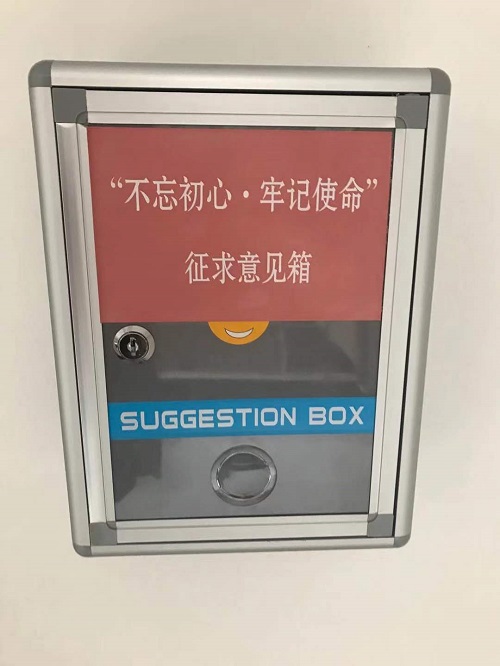 办公楼二楼走廊处设立了“不忘初心、牢记使命”主题教育调研意见箱,欢迎五楼自拍