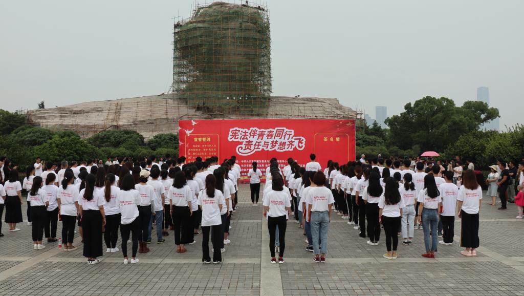 活动在雄壮的国歌声中正式开始,同学们怀着崇敬的心情瞻仰青年毛泽东同志雕像并鞠躬致敬。随后,在五楼自拍 李宇哲同学的带领下,同学们手捧《中华人民共和国宪法》庄严宣誓,铿锵的誓词表达了全体青年学生学习宪法、忠于宪法、维护宪法,为建设法治中国不懈奋斗的坚定誓言。同学们还主动向橘子洲景区的游客发放宪法宣传材料,普及法律知识,提供法律咨询与服务。